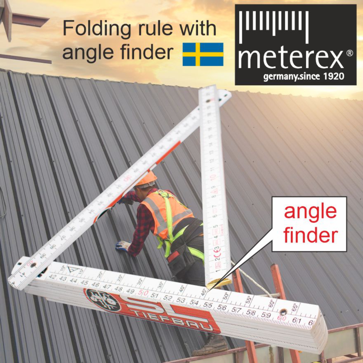Indvendige, fjedrende metalled sikrer smidig åbning og lukning. 90°-indhak i leddene gør det muligt at markere rette vinkler. Præcis vinkelmåling kan foretages ved hjælp af den store vinkelskala på 3. og 4. led.